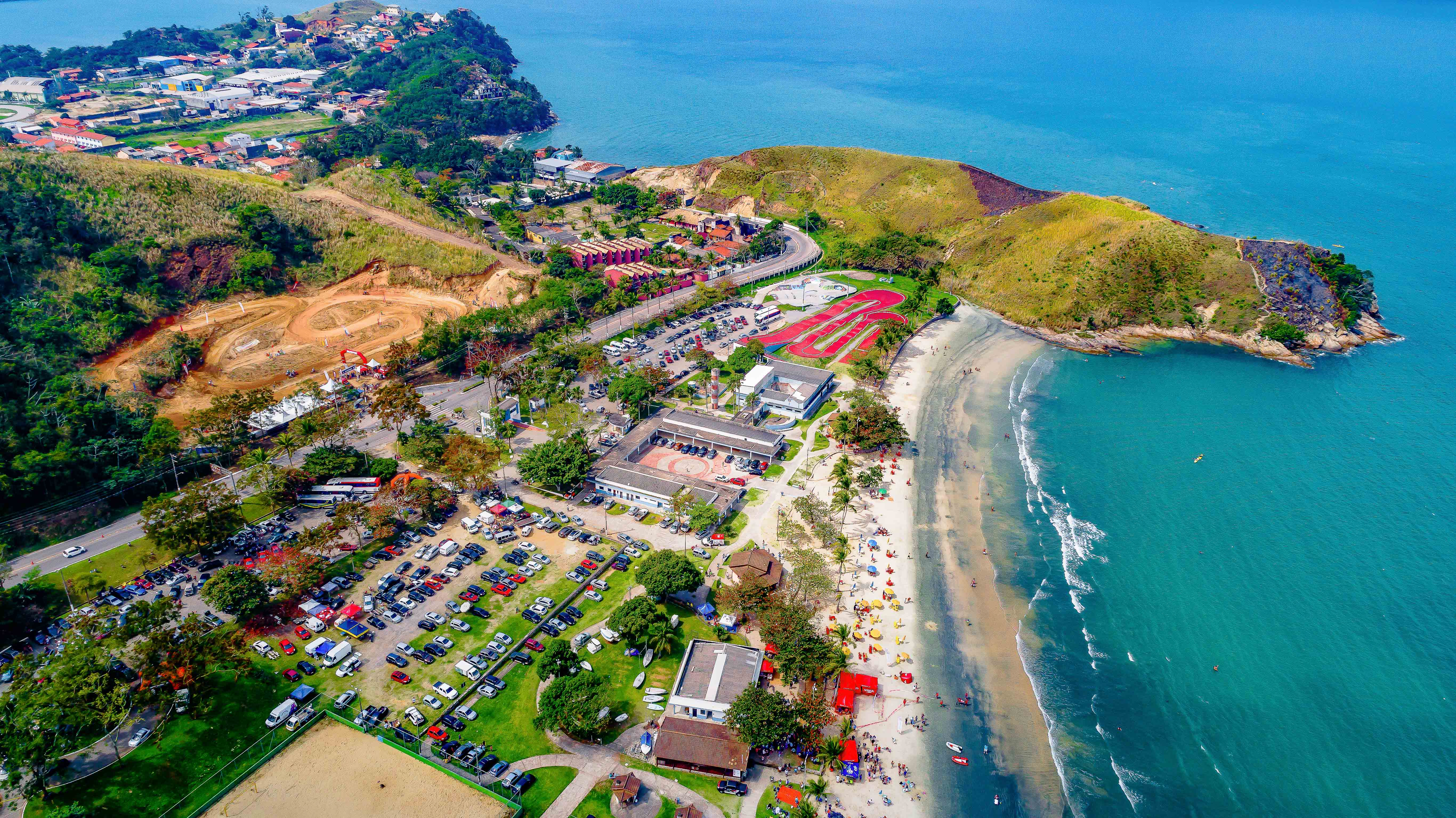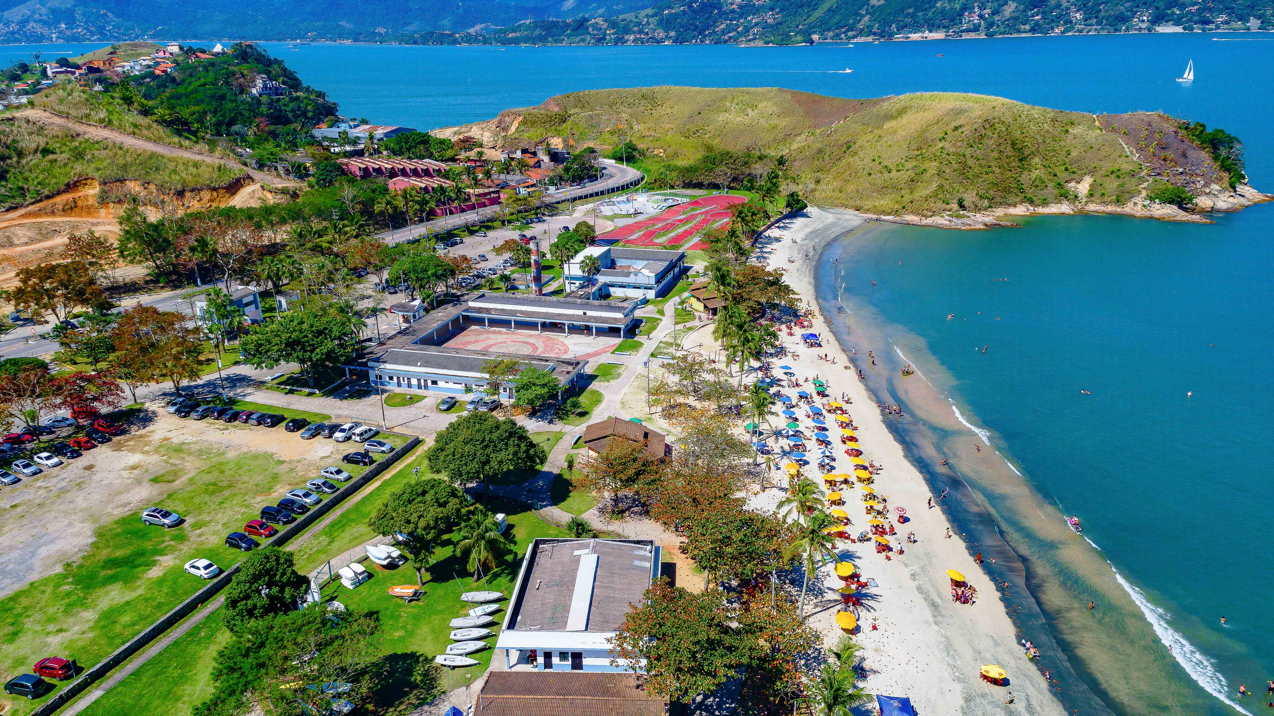 Área de lazer estruturada na Praia Grande, com mar raso e calmo, estacionamento controlado, quiosques, vestiários, quadras, pista de skate e museu marítimo, autorizada a receber excursões.