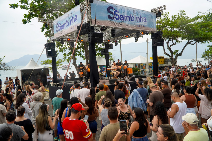 Praça Lourenço Luvisi, em São Sebastião, com música ao vivo, grupos locais, entrada gratuita e clima acolhedor. Ideal para uma tarde com amigos, dança, cultura e lazer ao ar livre.