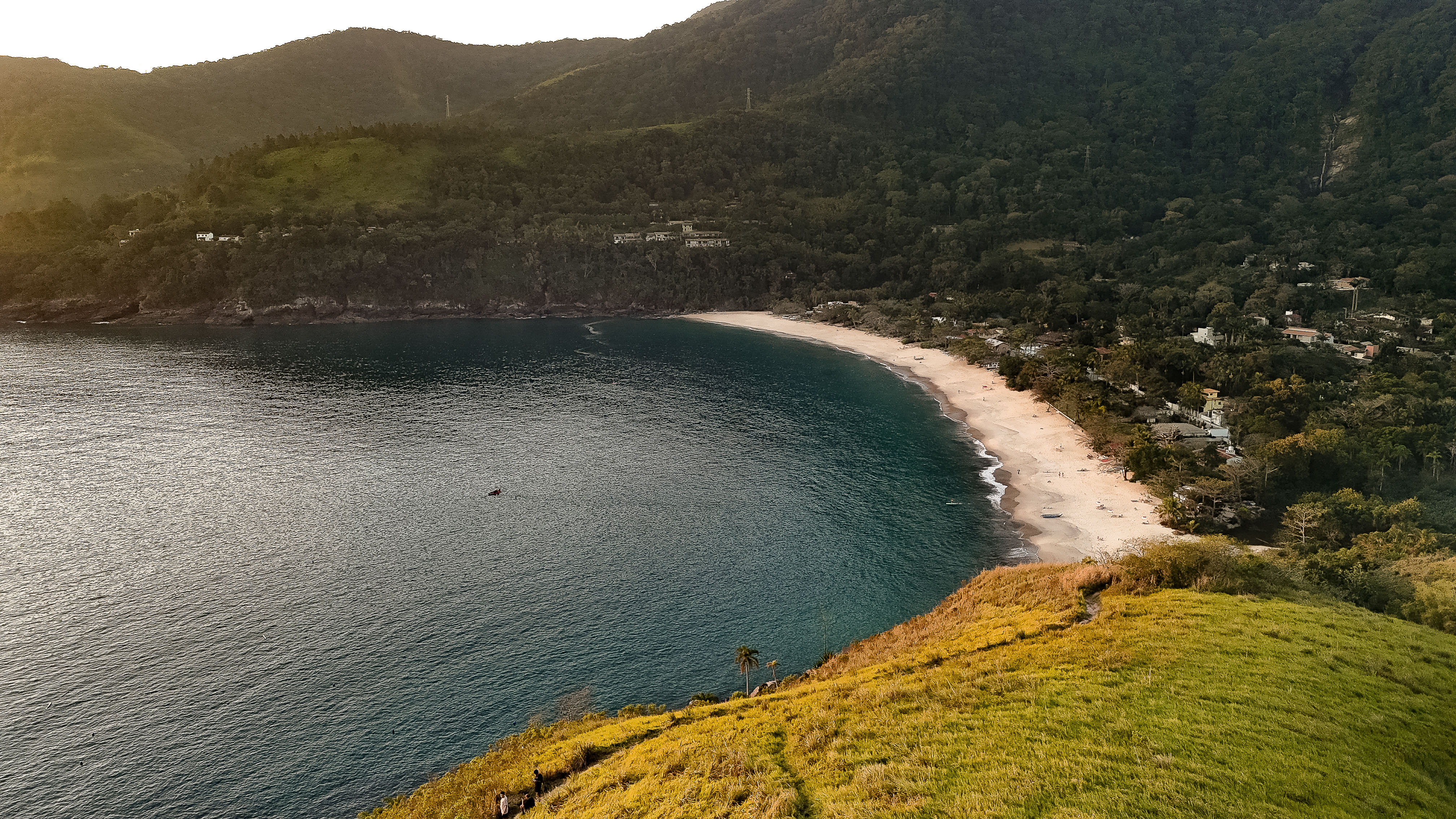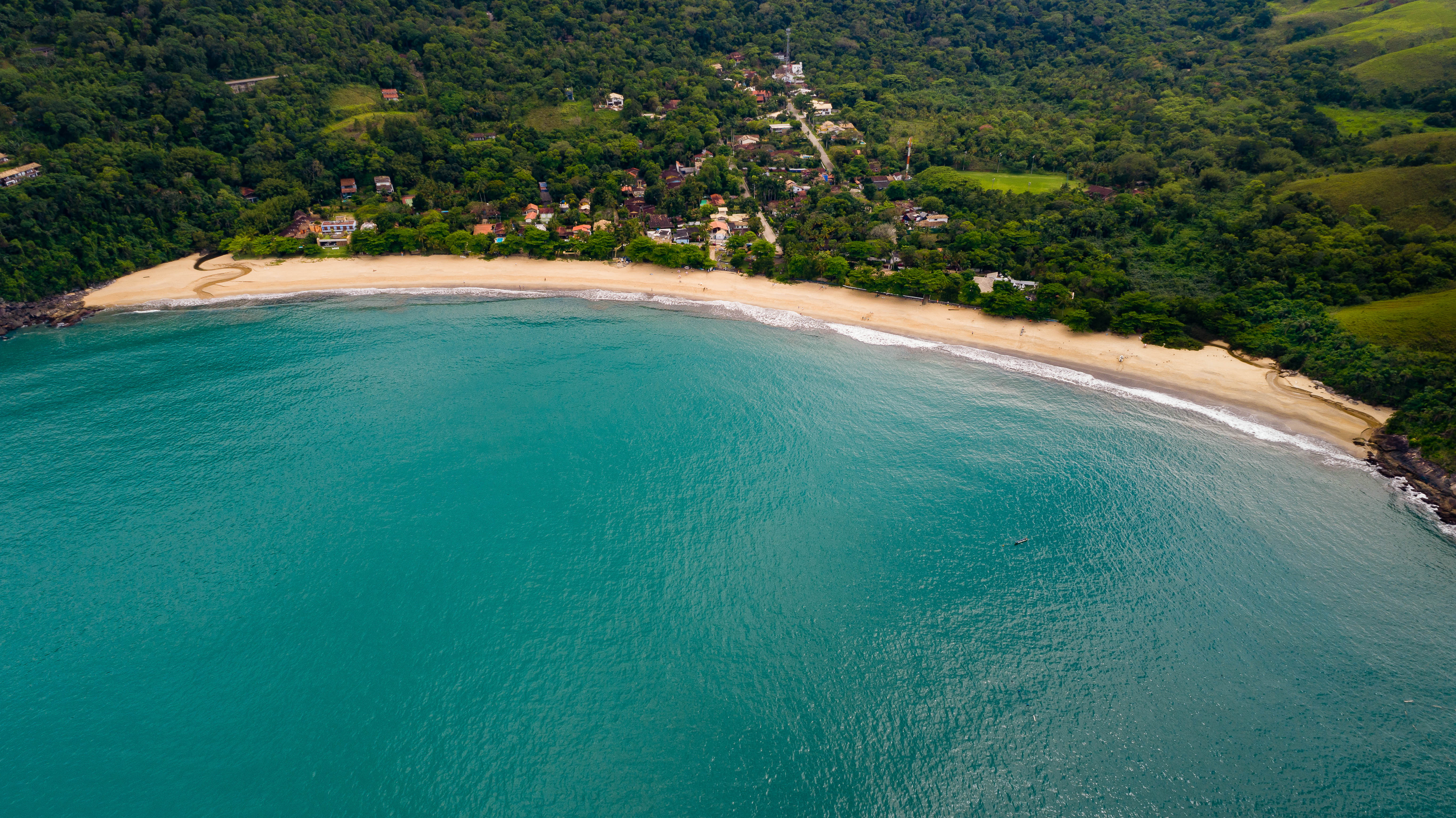 Pequena enseada de cerca de 600 m com mar calmo, vila caiçara preservada, poucas construções à beira-mar e vista privilegiada para a Ilha de Toque-Toque.